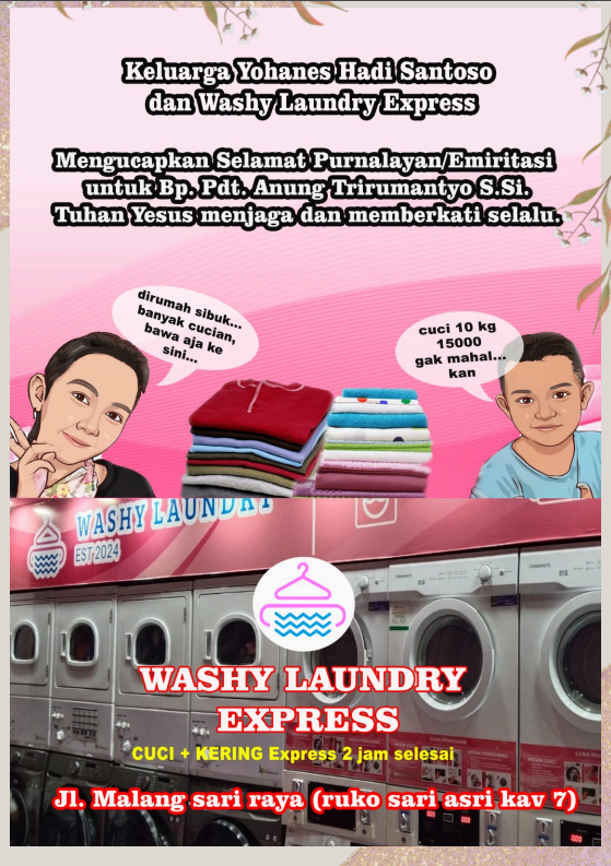 Dengan penuh rasa syukur dan hormat, kami, Keluarga Yohanes Hadi Santoso dan Washy Laundry Express, mengucapkan selamat memasuki masa emeritasi kepada Bapak Pdt. Anung Tri Rumantyo. Kami sangat bersyukur atas segala pelayanan yang telah Bapak berikan di GKJ Tlogosari. Dedikasi dan ketulusan hati Bapak dalam melayani Tuhan dan sesama menjadi teladan yang menginspirasi banyak orang, termasuk kami.